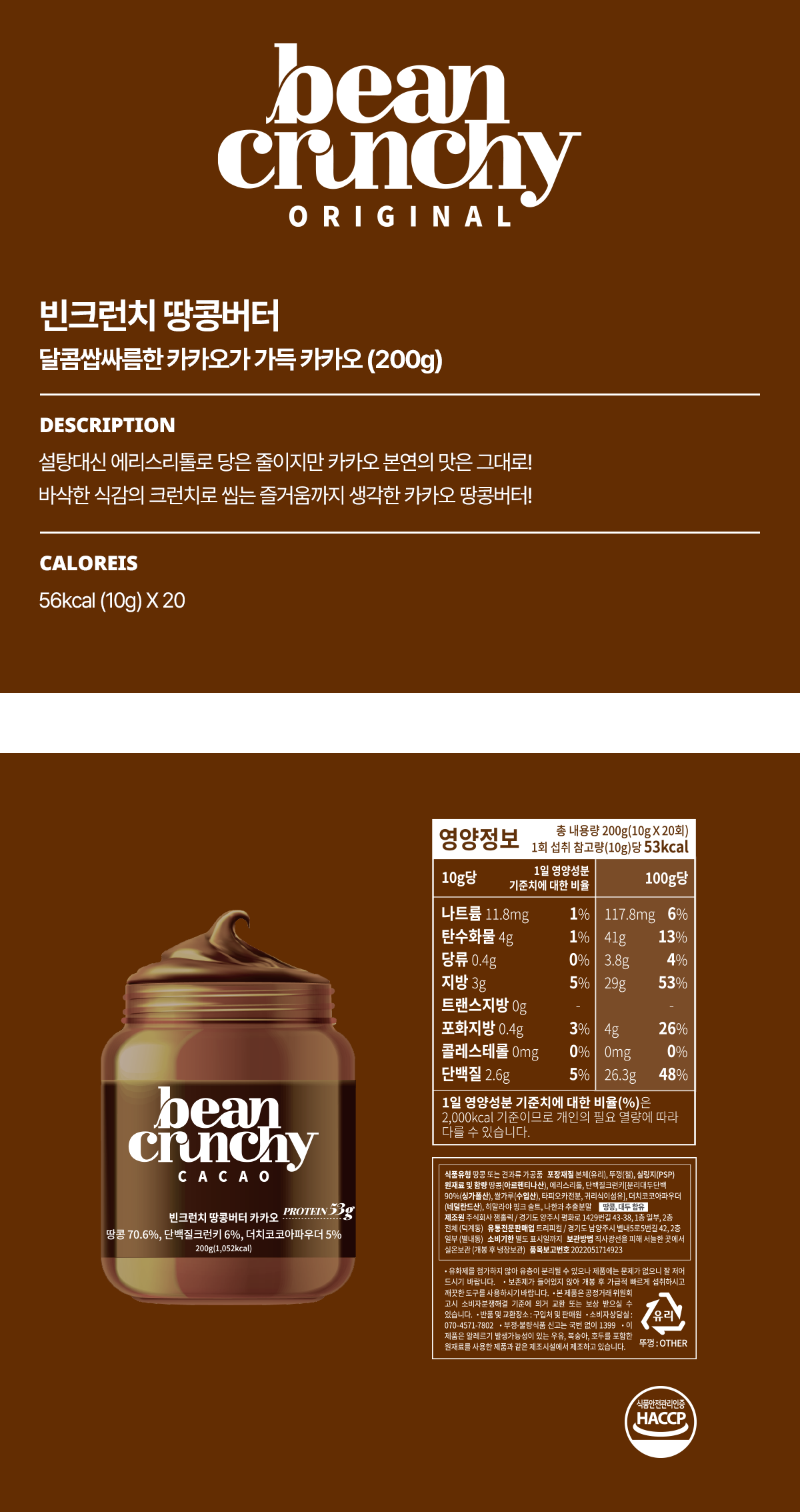 • 빈크런치 저칼로리 무설탕 건강 땅콩버터 잼 카카오맛