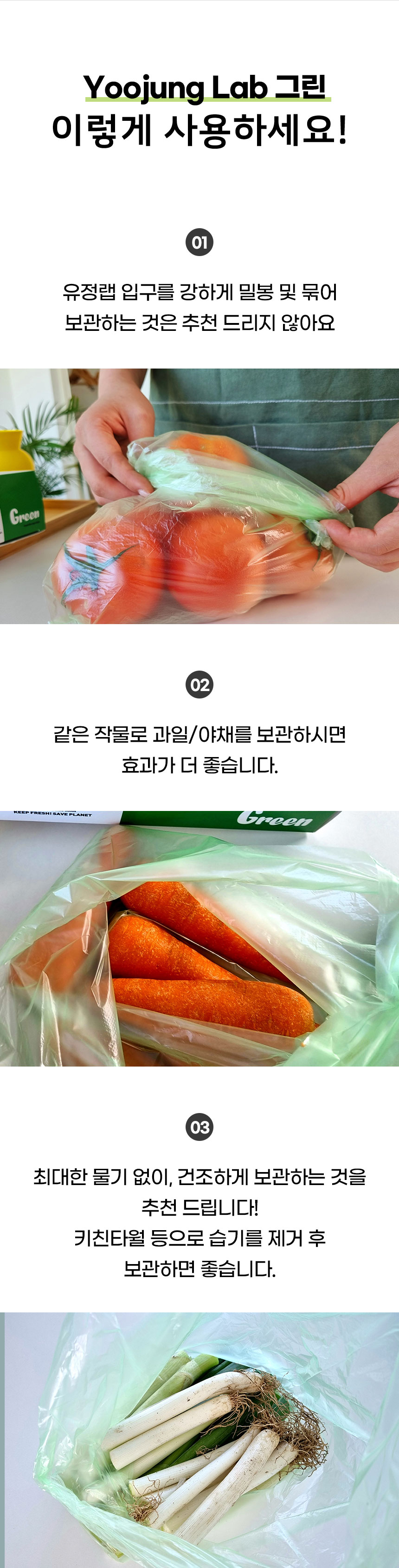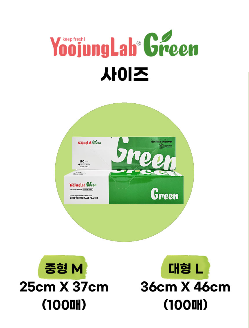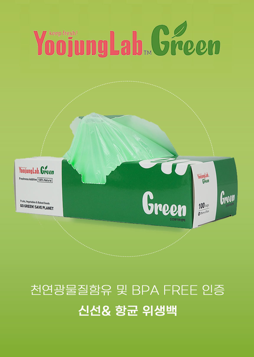 • 유정랩 그린백 중형 25x37cm 200매 신선유지 항균 위생백 야채 소분 식재료 보관 과일 통