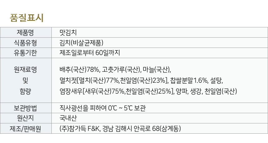 배추(국산)78%,고춧가루(국산),마늘(국산),멸치젓[멸치(국산)77%,천일염(국산)23%],찹쌀분말1.6%,설탕,염장새우[새우(국산)75%,천일염(국산)25%],양파,생강,천일염(국산)