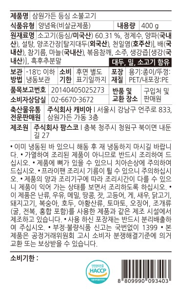 소고기(등심/미국산), 양파(국내산), 양조간장[탈지대두(외국산), 천일염(호주산)], 배(국내산), 마늘(국내산), 생강즙(생강(국내산)]