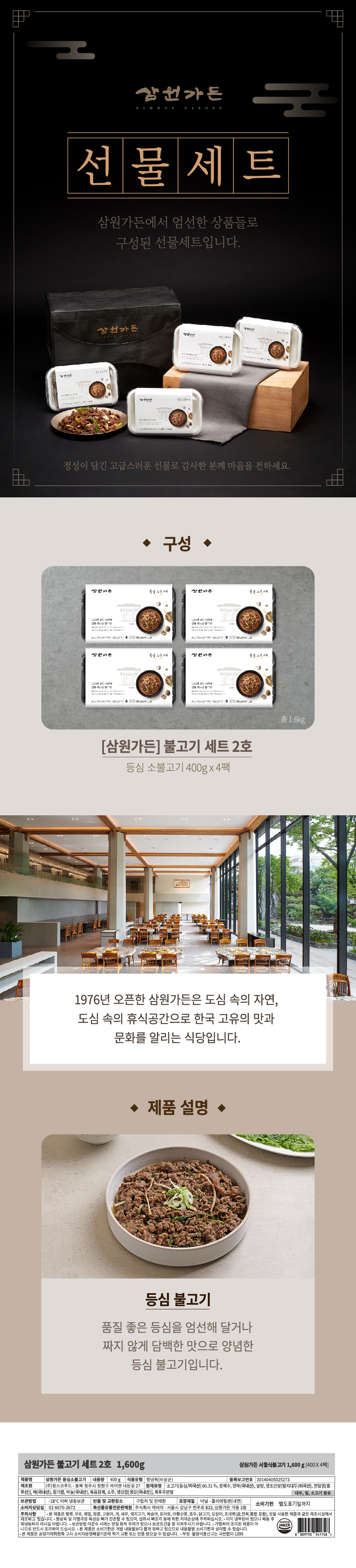 소고기(등심/미국산)60.31%, 정제수, 양파(국내산), 설탕, 양조간장[탈지대두(외국산), 천일염(호주산)], 배(국내산), 참기름, 마늘(국내산), 볶음참깨, 소주, 생강즙[생강(국내산)], 흑후추분말
