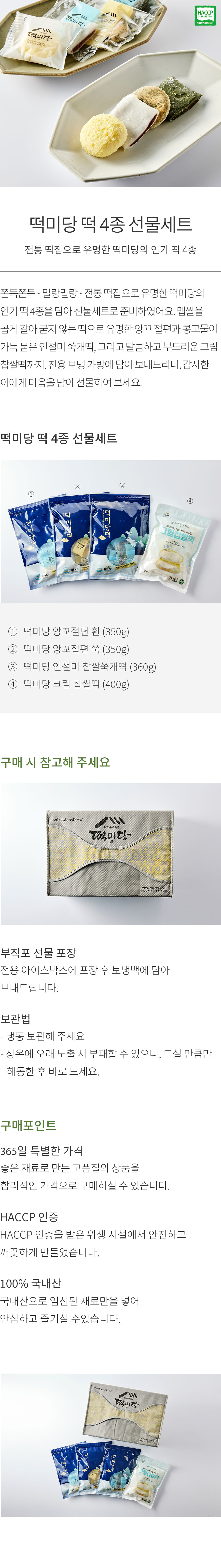 [전용포장] 떡미당 인기 떡 4종세트 (앙꼬절편2종/인절미쑥개떡/크림찹쌀떡) 수량빼기 수량추가 38,900 원 총 수량 1 개 38,900 원 구매옵션 닫기 선물하기 구매후기 44 상품상세 정기구독 장바구니 정기구독 장바구니 판매종료 정기배송 장바구니
