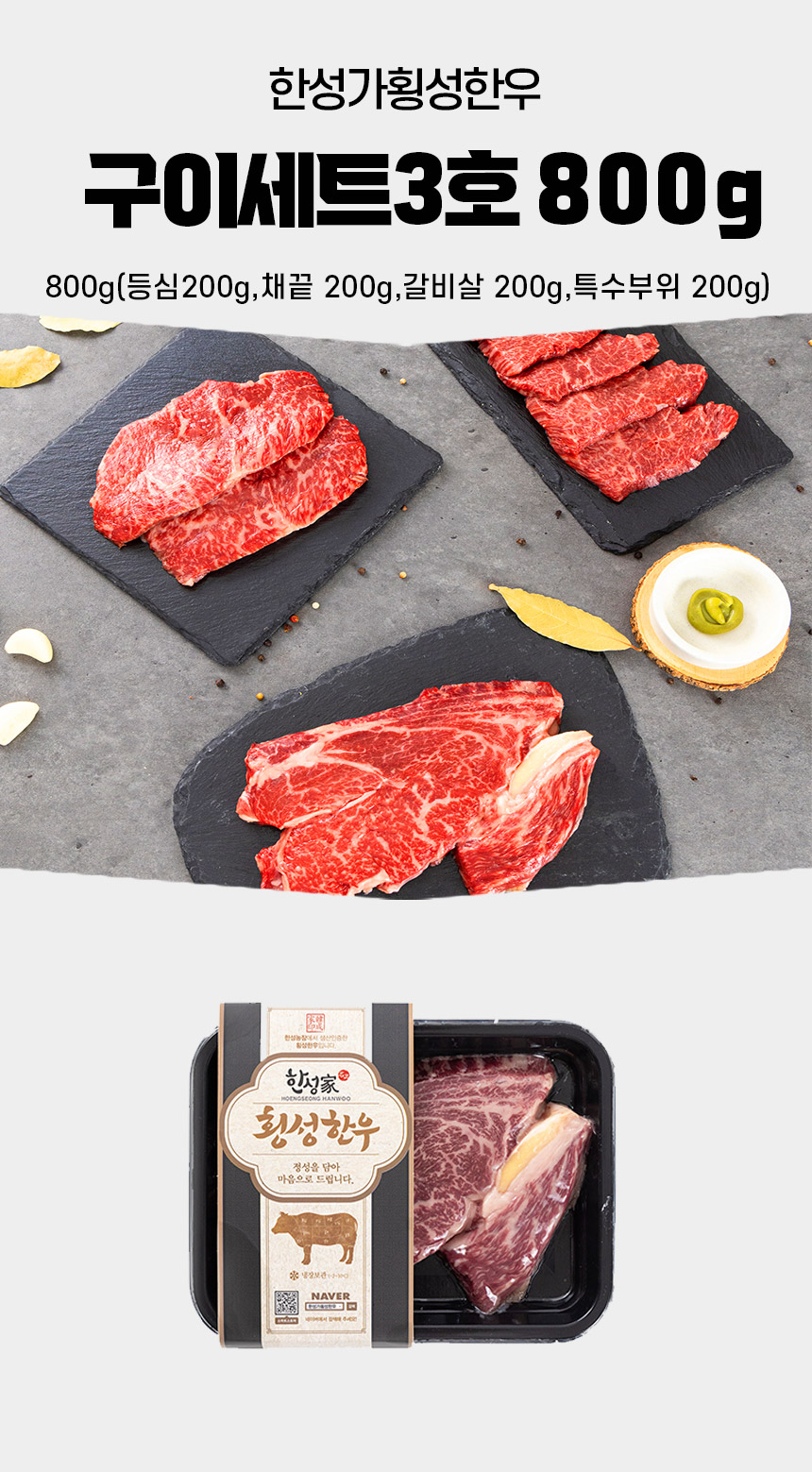 [한성가횡성한우]정품 횡성한우 투뿔등급 구이세트 3호 800g(등심200g,채끝 200g,갈비살 200g,특수부위 200g)