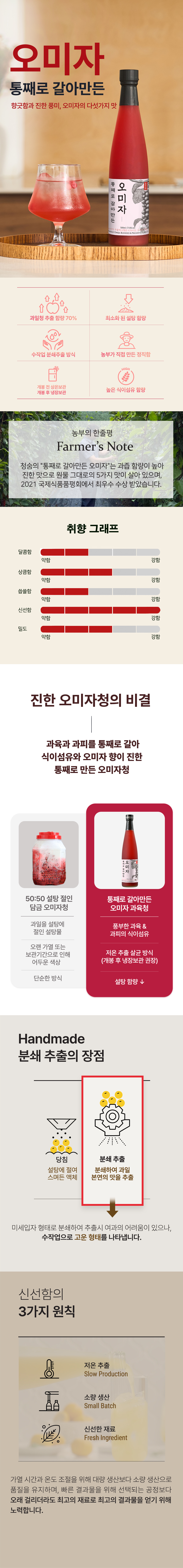 문경세제 오미자의 깊은 다섯가지 맛을 최대한 살리기 위해 저온에서 추출하며, 통째로 갈아만든 제품입니다.