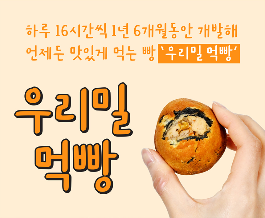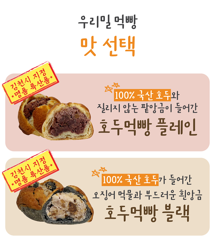한입에 먹기 편하게 쏘~옥! 우리밀과 국산 호두로 만든 특허등록된 가공 기술로 30년 이상 제과제빵 전문가와 함께 개발한 김천시 명품 특산품 ’우리밀 호두먹빵‘