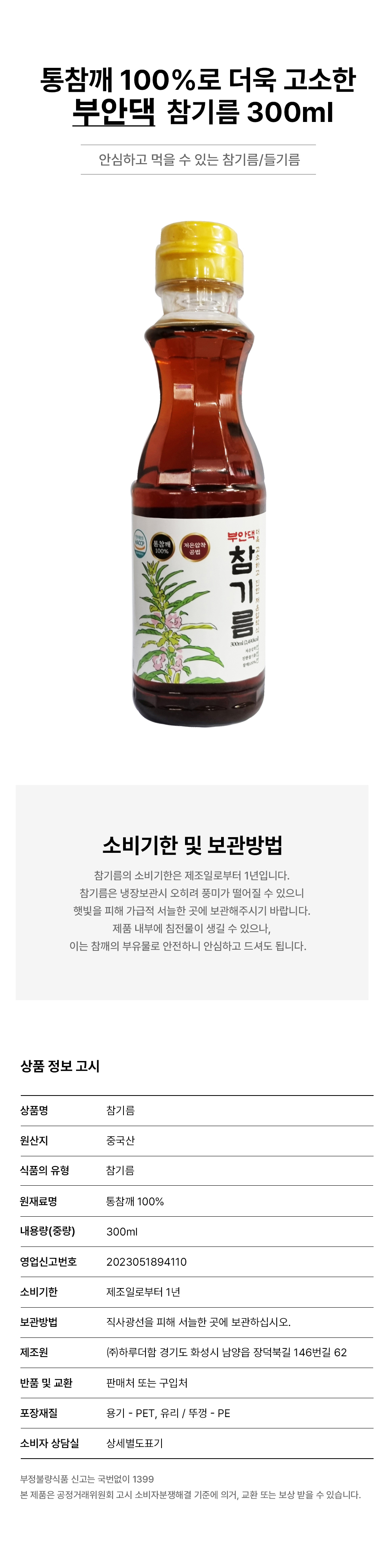 • 저온압착 방식 부안댁 참기름 300ml