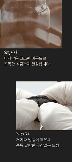 [영양정보] 총 내용량 200g (100g당 480kcal) 나트륨 38.4mg(2%), 탄수화물 74.4g (23%), 당류 64g (64%), 지방 16.8g (31%), 트랜스지방 0g, 포화지방 8g (53%), 콜레스테롤 8mg (3%), 단백질 8g (15%)