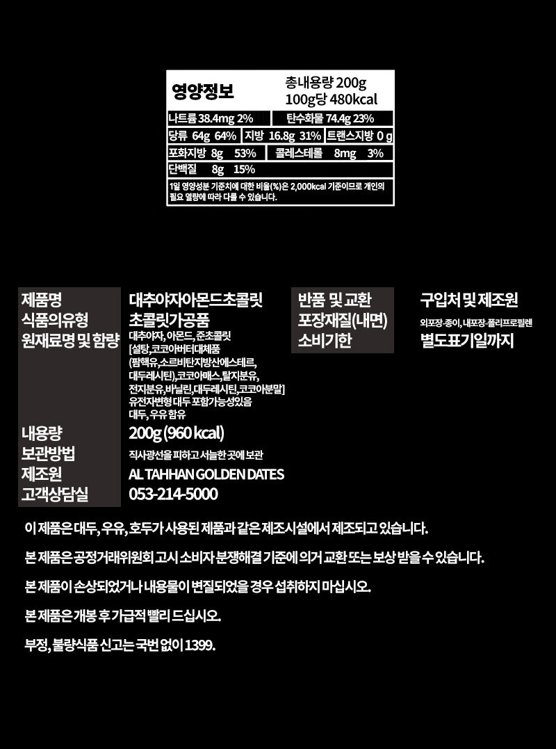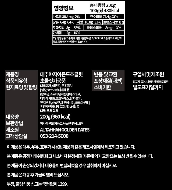 대추야자53%, 아몬드24%, 준초콜릿23%[설탕, 코코아버터대체품(팜핵유, 소르비탄지방산에스테르, 대두레시틴), 코코아매스, 탈지분유, 전지분유, 바닐린, 대두레시틴, 코코아분말] 유전자변형대두포함 가능성있음 [대두,우유함유]